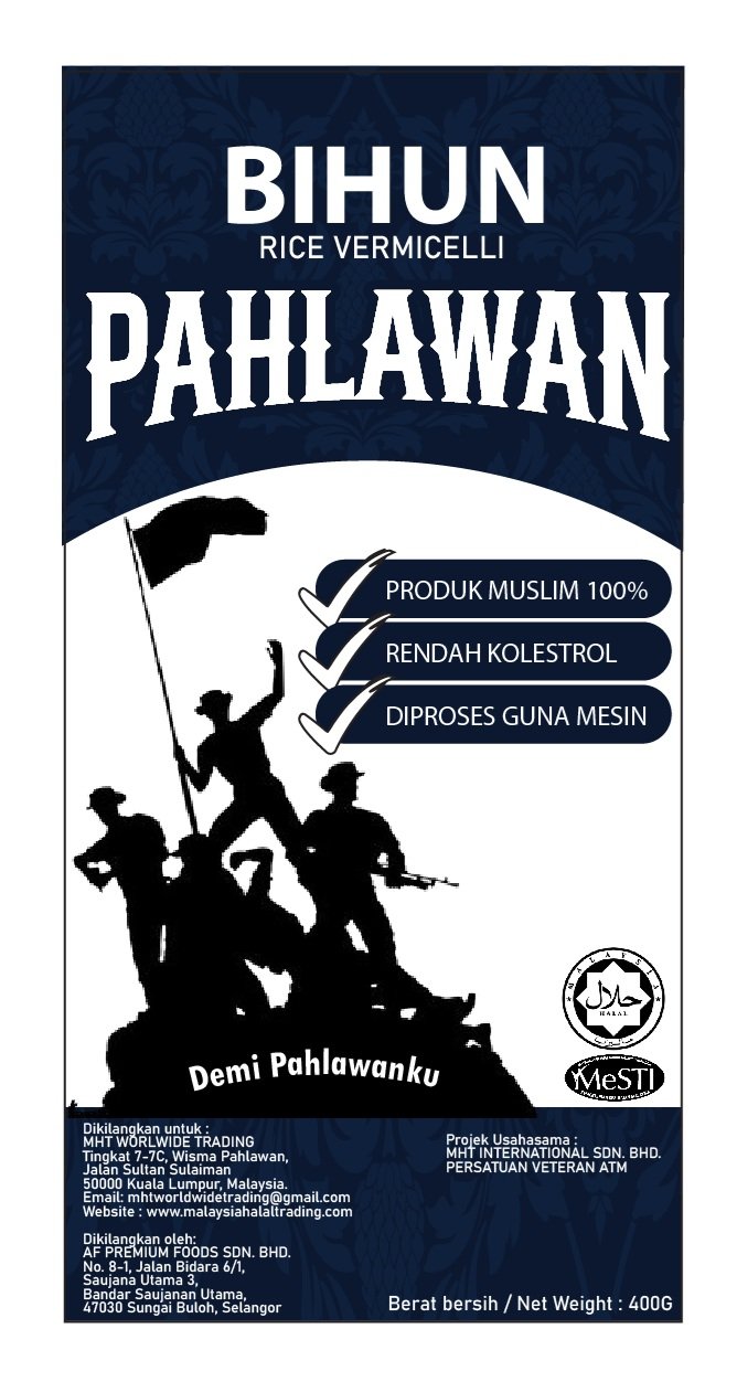 Akan Datang!. Produk Bihun Pahlawan. Keluaran kilang Muslim. Halal dengan berat 400g. Sesuai bagi hidangan sekeluarga.